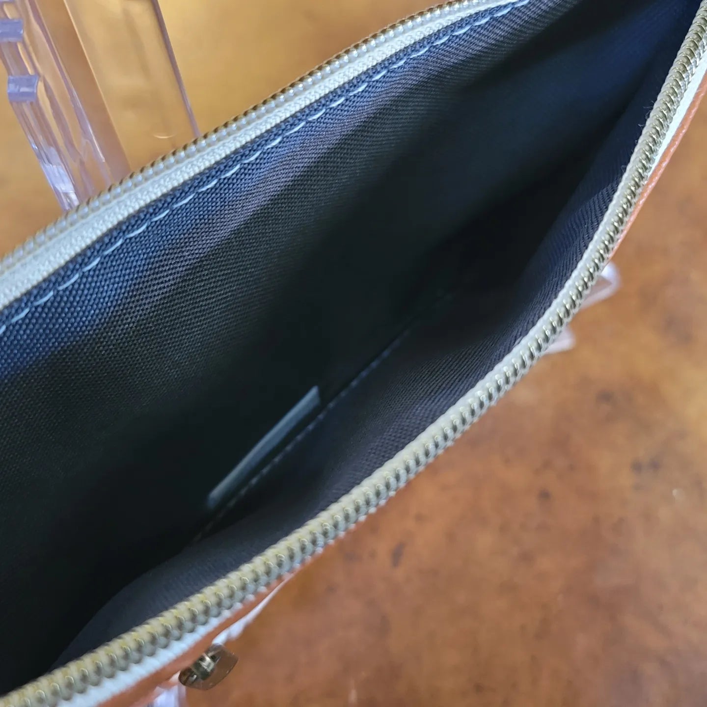 Features front zipper pocket, top zipper closure, side connector wristlet strap and a grey waterproof lining.